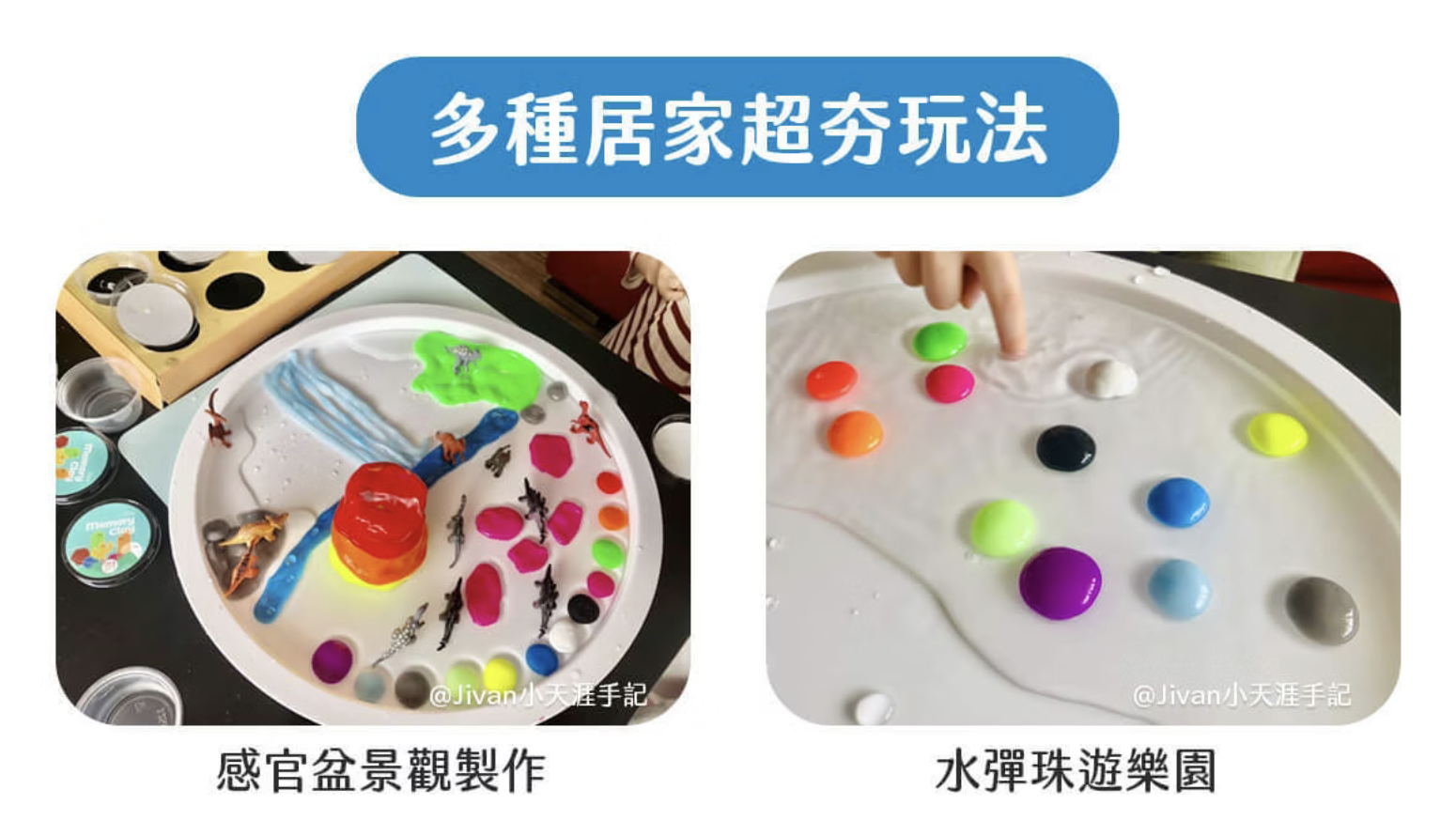 本身黏土含有抗菌成份,還可以放到水裡玩,若在水中玩完後直接用手擰乾,靜置在收納盒內即可。
