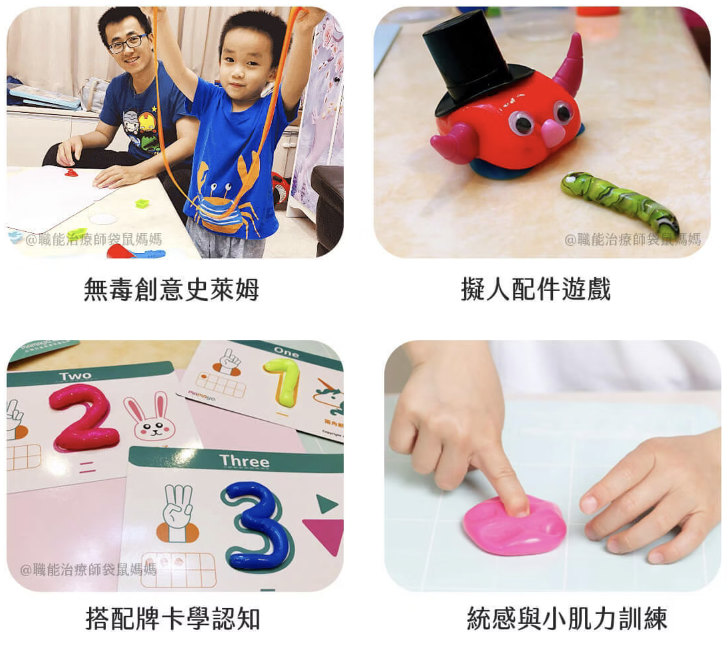 用途:可重複捏塑、手部肌肉訓練、混色學習、娛樂紓壓